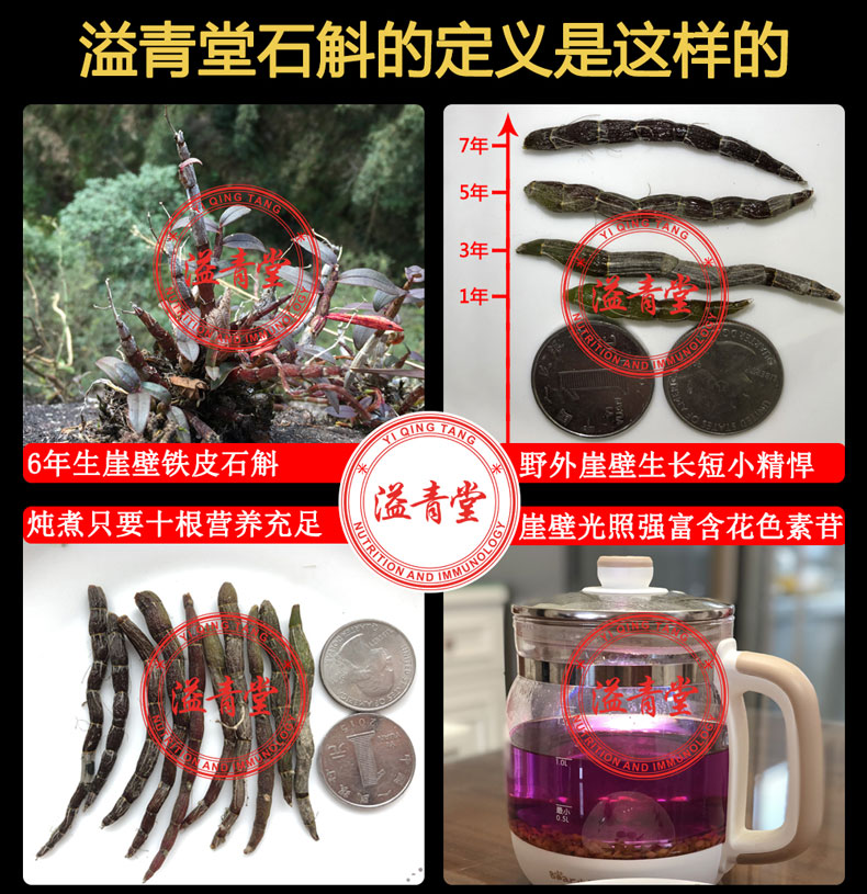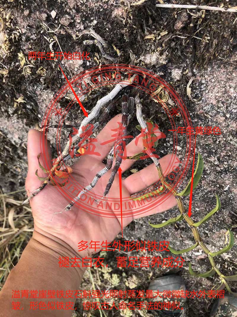 溢青堂悬崖峭壁——具有独特的地理优势,被列为世界级地理遗产保护区,是孕育石斛的天堂,这里的石斛被称之为石斛中的极品。无污染、原生态的崖壁、卷柏伴生,苔藓、枯草和泉水,是石斛的天然肥料,溢青堂崖壁铁皮石斛从不打农药不施化肥,效果和品质就是野生的,一亩崖壁5年后才可以产30斤石斛,其他种植方式农残避免不了也会对身体造成伤害,这样的石斛不如不吃。金钗石斛、紫皮石斛、铜皮石斛、水草石斛等数十种从外形上看很像铁皮石斛,所以市场上很多不法商家用来冒充铁皮石斛,产量大多到亩产1000多斤,价格很低廉,有些人以为自己买到了便宜货,殊不知自己买到的是假货,营养价值极低还有农残等。所以朋友们选购的时候一定要记得做对比,进行分辨。溢青堂凭良心坚持销售正宗的铁皮石斛,让需要的朋友身体健康才是根本。